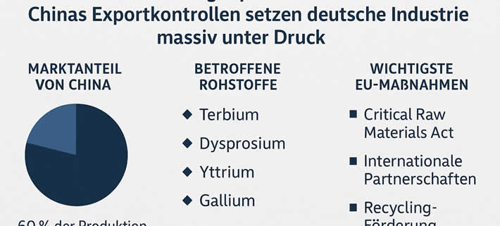 Die jüngsten Exportbeschränkungen Chinas für seltene Erden stellen deutsche Unternehmen vor eine existenzielle Herausforderung. Laut einer Umfrage der europäischen Handelskammer in China drohen bereits ab September 2025 bis zu 46 Produktionsstopps bei europäischen Firmen, da Exportgenehmigungen fehlen. Betroffen sind vor allem Industrien, die auf Hightech-Bauteile angewiesen sind: Automobilhersteller, Maschinenbauer, die Luft- und Raumfahrt sowie die Rüstungsindustrie.