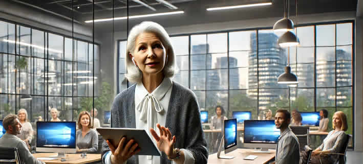 Ganz vorne auf dem Bild sehen wir Frau Dr. Elvira Hirnschmalz. Sie ist bekannt für ihre brillante Intelligenz und ihre unerschöpfliche Energie. Trotz ihres Alters kann sie es immer noch mit jedem jungen Hüpfer aufnehmen. Mit ihrem Tablet in der Hand ist sie vermutlich gerade dabei, die neuesten Innovationen und verrückten Ideen der Stadt zu koordinieren. Man munkelt, dass sie sogar im Schlaf neue Projekte plant!