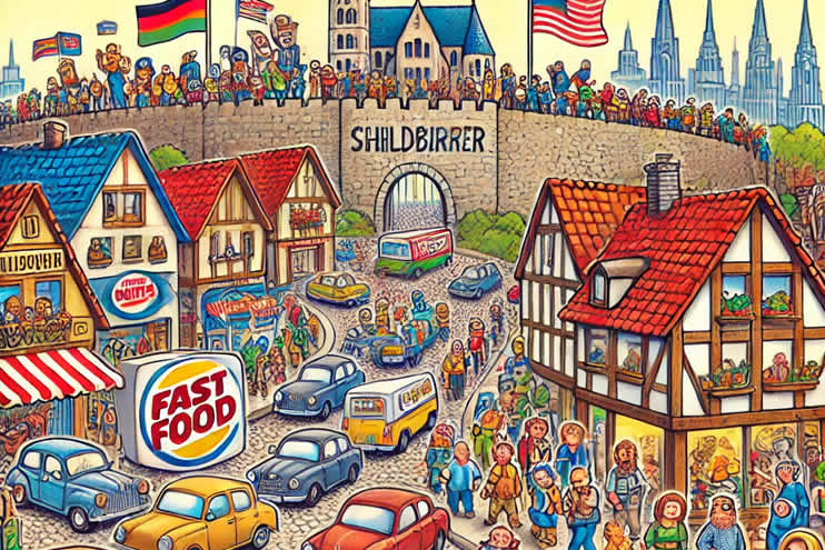 In der berühmten Stadt Schilda, wo die Menschen für ihre eigenartigen, aber lehrreichen Einfälle bekannt waren, geschah eines Tages etwas ganz Besonderes. Die Bürger hatten gehört, dass in einem fernen Land namens Amerika ein großer Mann namens Donald T. eine riesige Mauer bauen wollte, um sich vom Rest der Welt abzuschotten.