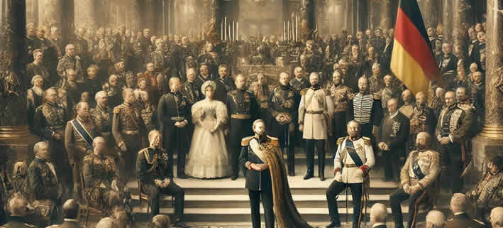 Die Proklamation des Deutschen Reiches im Spiegelsaal des Schlosses von Versailles fand mitten im Deutsch-Französischen Krieg (1870–1871) statt. Dieser Krieg war der Höhepunkt einer Serie von militärischen Auseinandersetzungen, die Bismarck gezielt herbeigeführt hatte, um die deutsche Einheit unter preußischer Führung zu erzwingen. Der Sieg über Frankreich und die darauffolgende Einnahme von Paris bildeten die Grundlage für die Reichsgründung. Am 18. Januar 1871 wurde Wilhelm I., der König von Preußen, zum ersten deutschen Kaiser gekrönt. Dieses Datum markiert nicht nur das Ende des Krieges, sondern auch den Beginn eines neuen deutschen Nationalstaates.